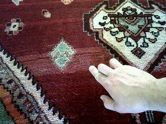 Each rug is inspected for any pre-existing conditions. In most cases soil covers up variations in dye (abrash), fibre staining, prior dye bleeding, worn areas or white knots that become “uncovered” after the wash. Some of these are weaving characteristics (abrash and white knots), and others are damage that can possibly be repaired or reversed. The dyes of your rug are tested for colour fastness. If the dyes are not colourfast, then the rug is prepared by setting the dyes. The pre-wash inspection allows us to choose the correct method of cleaning for your precious rug.